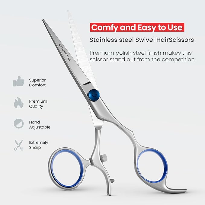 - โ๏ธ Precision Cutting: This haircut scissors for hair cutting has a convex razor-sharp edge that allows precise cutting without pushing or bending hair. Blue screw adjustment knurled knob with backing plate allows for fine-tuning and smooth motion for hair cutting or grooming. Our shears for hair cutting and hair cutting shears for stylists designed for accurate, precise cutting and trimming. We Promise Theyโll Not Disappoint You!