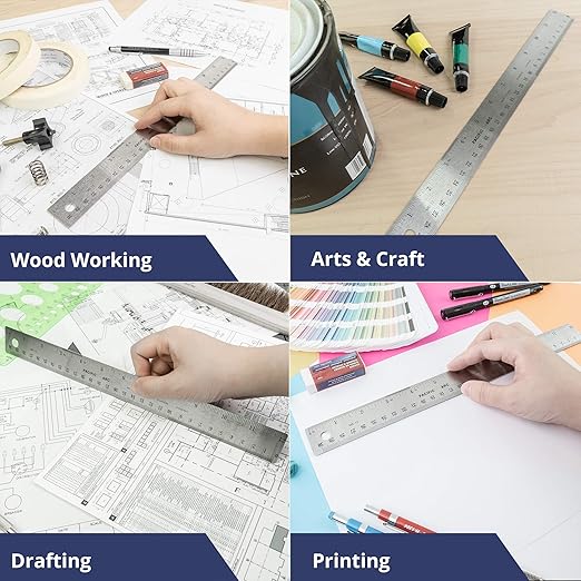 - NON-SLIP RUBBER BACKED- the rubber back on the metal ruler provides a durable non slip backing to prevent unwanted movement during use. This provides the flat metal ruler with a versatile use use for projects at home or work. It's perfect for sewing, quilting, drawing, drafting, designing, and much more.