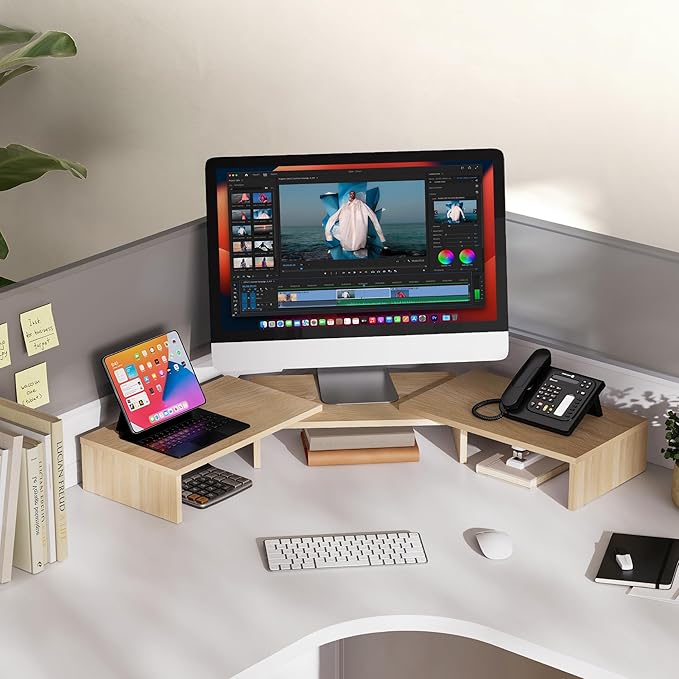 - 【Longer Size with More Space】At longest 42.7inch wide, this laptop riser is big enough to support two monitors. Depending on your setup, you may even have room to place a speaker or another device in the middle. Creates enough space underneath for smaller desk essentials, or to tuck your keyboard and mouse away.