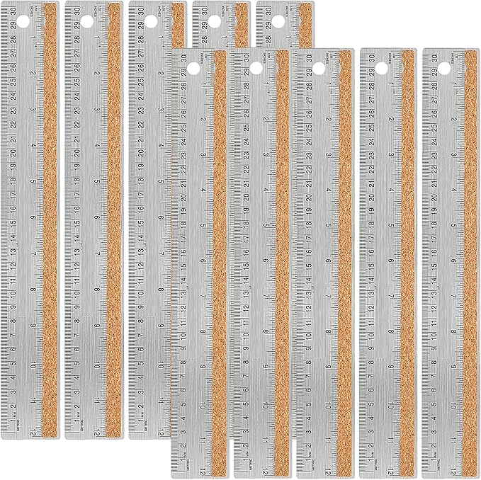 - METAL RULER CORK BACKING - The set contains 10 pieces of metal ruler, the sizes are 12 inches, with cork backing to prevent ink from getting under the stainless steel ruler. Hanging holes make it easy to store the ruler after use.
