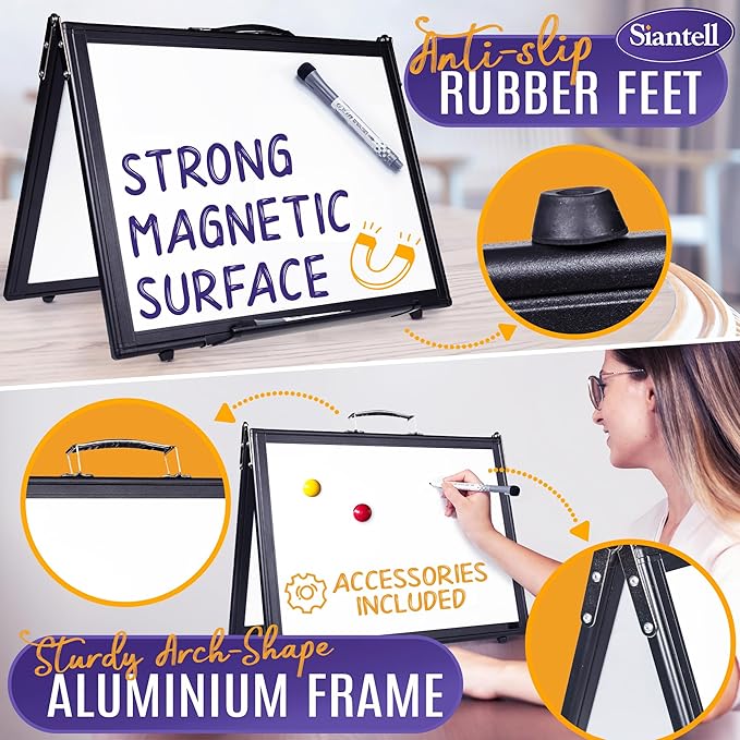 - JUGGLE ALL OF YOUR TASKS MORE MANAGEABLY – The perfect small dry erase board to boost your productivity and organization by easily tracking & visualizing your home or office assignments. Siantell designed the sturdiest & most compact portable magnetic dry erase board you could ever need. This stain-resist table top white board has smooth surfaces and cleans up quickly without ghost marks. Get a ton of use out of this whiteboard easel for notes, reminders & to-do lists. It’s never been easier!
