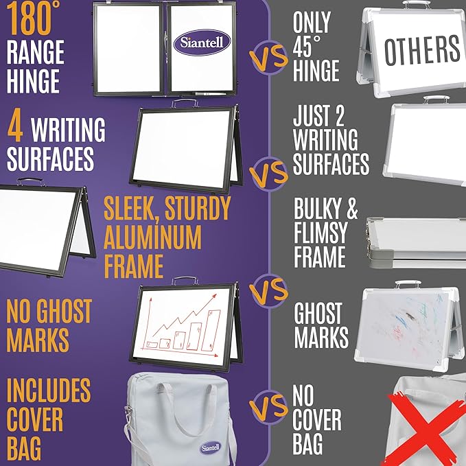 - WHILE OTHER TABLETOP DRY ERASE BOARD HAVE DOUBLE SIDES that don't give you enough space to write, the Siantell portable dry erase board has four 16"x12" writing surfaces that allow you to flip the foldable whiteboard over to write on a clean surface when the other side is full. You will no longer feel cramped for space or need to erase continually and re-write on our ready to use portable whiteboard. We value your needs!
