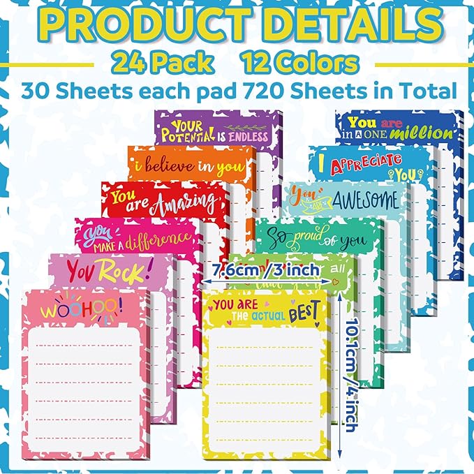 - Large Quantity: you will receive 24 pieces appreciation sticky notes in 12 assorted styles, 2 pads of each style, 30 sheets of each pad; Each pad measures 7.6 x 10 cm / 3 x 4 inches, with enough space for writing notes; The sufficient quantity and rich design can meet your daily needs, you can also share with your family and partners