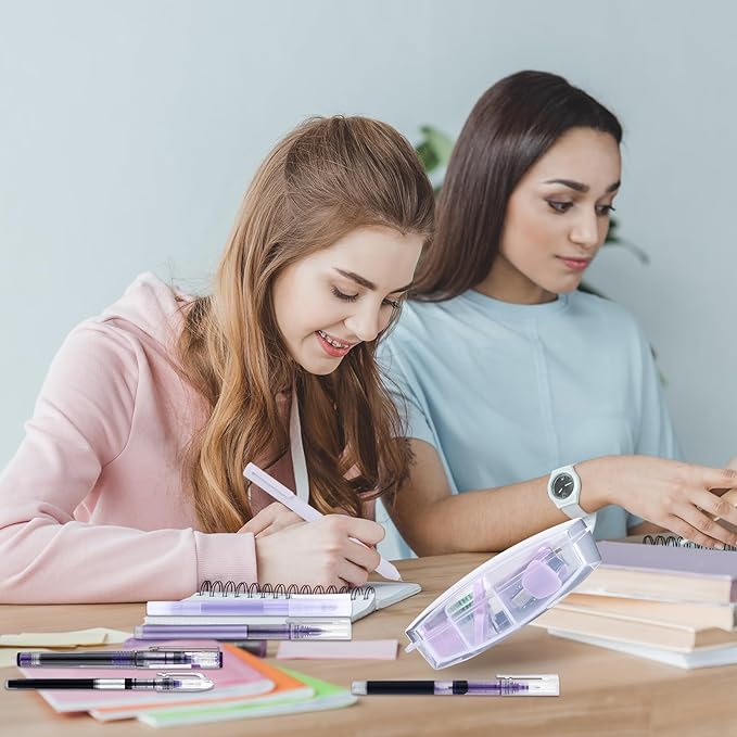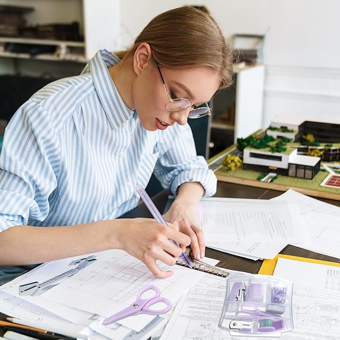 - Purple Suit: stationary school supplies includes 1 mini stapler, 1 sharpener, 1 tape dispenser, 1 scissor, 1 staple remover, 500 pieces of staples, 20 pieces of paper clips, 5 pieces of pens, 1 fluorescent pen, 12 pieces of long tailed clips, 1 note, 1 small telescopic knife and 1 box; A set of packaging can meet your various office and study needs and save your matching time