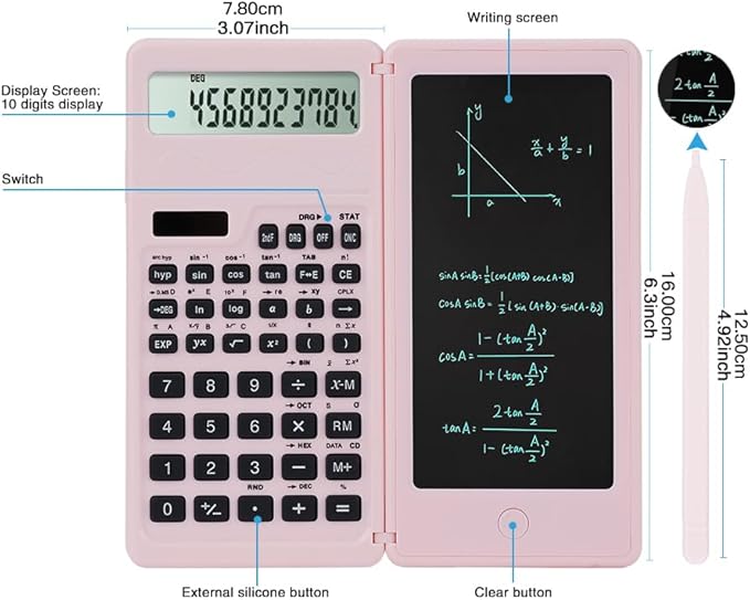 Scientific Calculators for Middle School & High School, Solar and Battery Power with Notepad for School,10 Digits Digital with Erasable Writing Board Math Calculator (Pink)