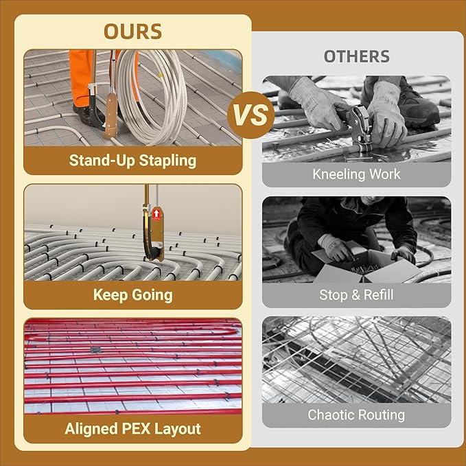 - Multi-Scene Use: The PEX staple gun is ideal for radiant floor heating pipe installation in homes, offices, schools, shops, and malls. A must-have tool for professionals and DIYers to secure PEX pipes quickly and neatly