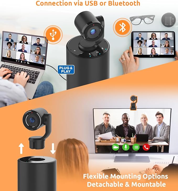 - Plug and Play Convenience: Enjoy quick and easy meeting setup with the conference camera. Simply plug it in, connect the power and USB, launch your preferred video conferencing platform, and start your meeting. The camera can be directly mounted on the speaker or flexibly placed on any desktop, monitor, laptop, Chromebook, PC, or tripod using the included display stand.
