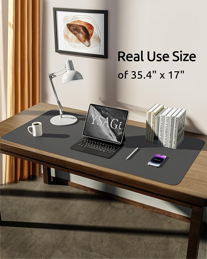 YSAGi Leather Desk Protector, Office Mat, Large Mouse Mat, Non-Slip PU Leather Blotter, Laptop Desk Pad, Waterproof Writing Pad for Office and Home (Dark Grey, 35.4" x 17")