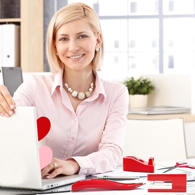 - 【Package Includes】This Red office supplies contains 1x Red Large Stapler, 1x Red Magnetic Staple Remover, 1000x Staples, 1x Red Tape Dispenser, 1x Office Scissor, 50x Paper Clips,3 Colors heart sticky notes.