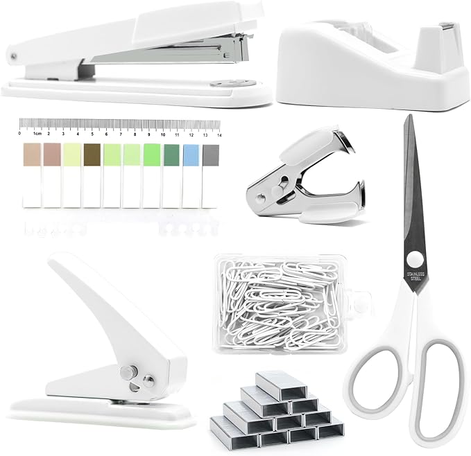 - 【Package Includes】This white office supplies contains 1x White Large Stapler, 1x White Staple Remover, 1000x Staples, 1x White Tape Dispenser, 1x Office Scissor, 50x Paper Clips and 10 colors Tabs with ruler.