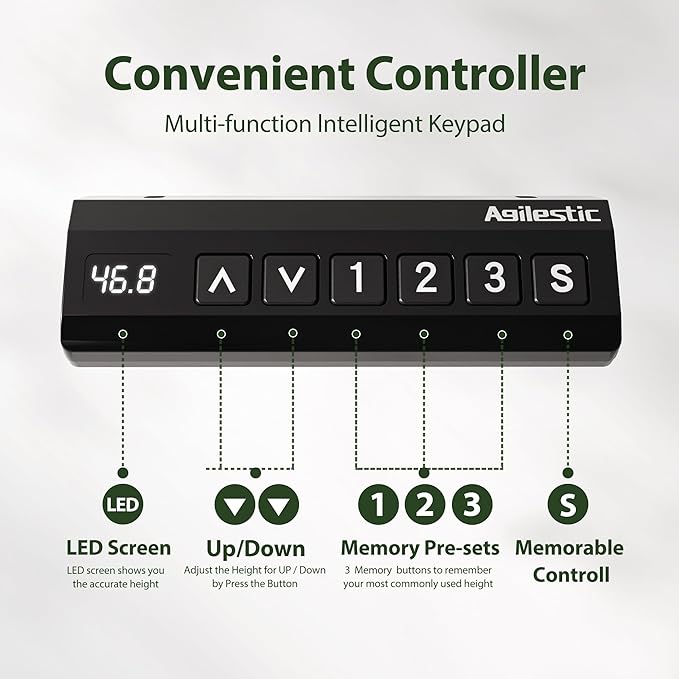 - 【Electric Lifting System】Agilestic standing desk has an advanced motor that can support height adjustment between 27.8"-45.9" with low noise(under 55 dB) while running. You can customize the desired height and record it using 2 memory keys.