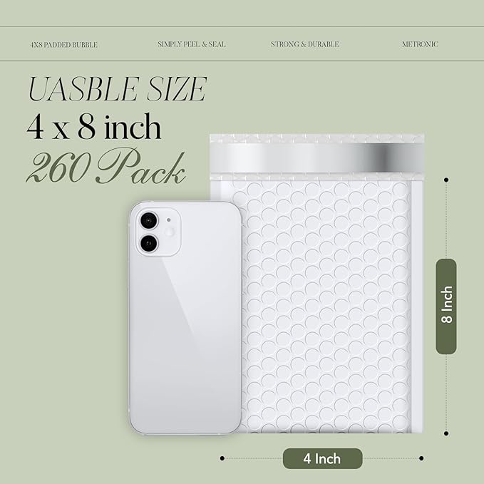 - 【 White Bubble Mailers 4x8 】: The 4x8 bubble mailer inner size are 4x7 inch. The mailing envelopes bubble padded very suitable to transport jewelry, sports cards, phone cases as padded mailers, shipping packages and packaging for small business.
