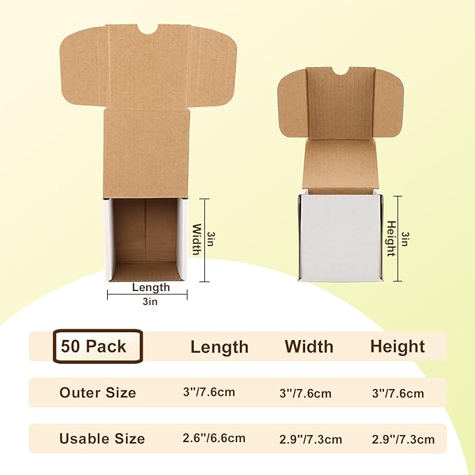 - Dimension: The white shipping boxes with an outer size of 3'’x3''x3'', and a usable size of 2.6''x2.9''x2.9''. With 50 packs of our affordable shipping boxes, it is suitable for packaging small business.