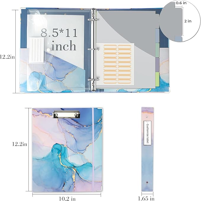 1 Inch 3 Ring Binder Organizer with Clipboard, 5-Tab Pockets Dividers, Clear Folder, 18 Divider Stikers, BVSSX Decorative Three Ring Binder with Pen Loop, Elastic Strap (Blue Marble,Letter Size)