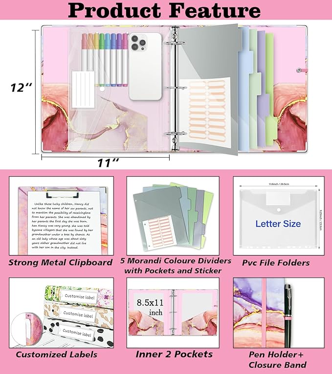 - 【3 Ring Binder wirth Clipboard】The versatile 2 inch binder front has a metal clip board to hold up 500 sheet, extra storage with 2 interior pockets, 5-Tabs plastic pocket dividers, 18-divider label stickers, a Clear Plastic Folder, Pen Holder, Elastic Closure Straps and Rounded Metal Corner Protection. A blank lable with slot for easy customization of spine. Folded size: 12*11*2.8 inches, large than normal binder.