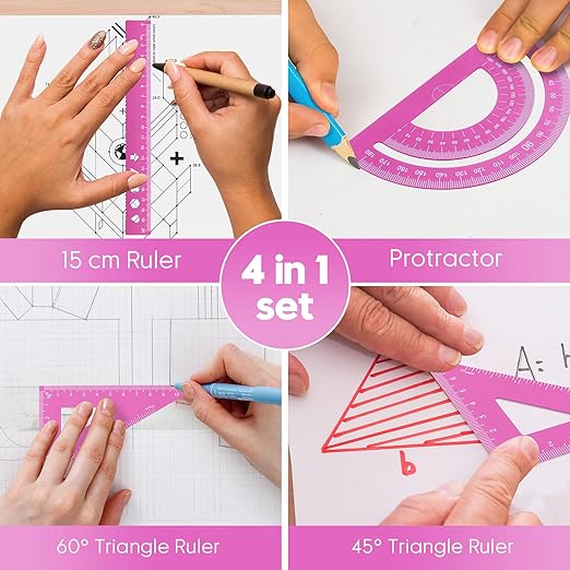 - Comprehensive Set: Our math geometry tool set includes 2 triangular rulers, 1 protractor, and 1 straight ruler, providing everything you need for precise mathematical measurements.