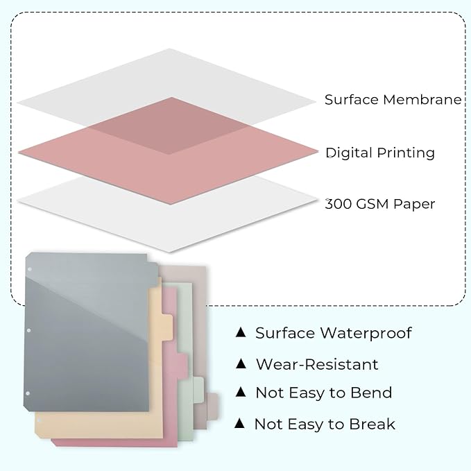- Premium Material - The dividers with tabs are made of 300 GSM paper, not easily break or bend. Surface membrane technology makes the digital printing pattern of cute binder dividers waterproof, and more wear-resistant