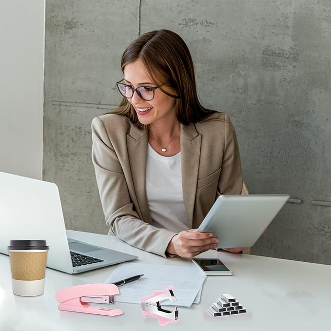 - When you buy this chic desk accessories gift set you will get one pink stapler, one staple remover and 1000pcs staples. These office supplies are decorative and yet professional. Perfect for the classroom, home, desk, or as executive office decor.