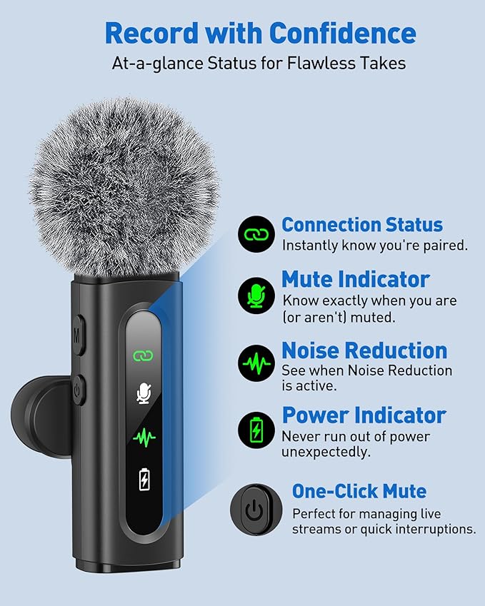 - Plug &Play with Intuitive Interface: GoorDik wireless mini mic is an effortless operation. Each function is accompanied by corresponding indicator lights. You can set the different functions of noise reduction, original sound, and mute function easily with the intuitive user interface. Plus, it is equipped with 1 rotatable microphone clip on each mic transmitter, allowing you to adjust the direction for optimal omni-pickup, enhancing your recording audio.