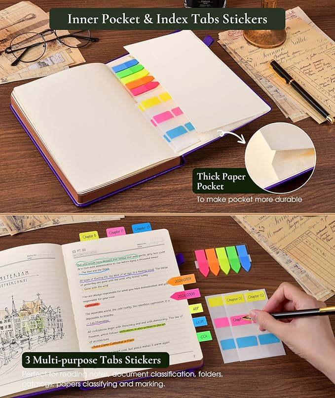 - 【BUILT-IN FEATURES FOR CONVENIENCE】This journal notebook comes with several useful features.The 1 built-in back pocket is ideal for storing loose papers or small items. The 1 elastic pen holder keeps your pen handy at all times.The 2 elastic closures ensure that the notebook stays securely closed.Additionally, the 3 colored ribbon bookmarks help you easily find your place.And the 3 free sticky tabs are great for marking important sections.