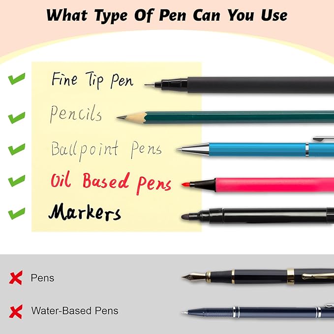 - FRIENDLY HELPFUL HINTS: To enhance your user experience, we recommend using pencils, ballpoint pens, or oil-based markers. We do not recommend using water-based pens, gel pens, or common markers unless you are willing to wait for the handwriting to dry after using a water-based pen. Please avoid wiping the handwriting immediately