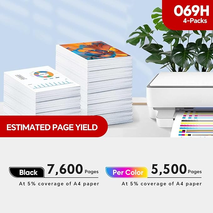 - High Page Yield: Up to 7,600 pages per 069H black toner cartridge, Up to 5,500 Pages per 069H cyan magenta yellow toner cartridges at 5% coverage of A4 Paper