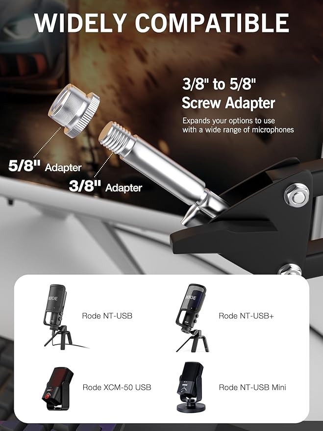 - 【Package】- Includes RODE NTUSB Mini mic stand, table mounting clamp, cable sleeve and 3/8" to 5/8" Screw Adapter. Attention: 1.Not includes RODE NTUSB Mini microphone. 2.You should take apart the base of microphone (include the microphone adapter )for matching the adapter before connecting to the microphone stand.