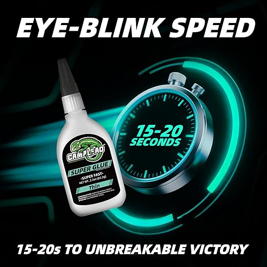 - [CAMALEAO SUPER GLUE]: More than just strong and fast— Thin adhesive has an impressive 2610 PSI strength and a rapid cure time of 15-20 seconds. This super glue is compatible with plastics, metal, leather, wood, ceramics, pottery and other materials to ensure reliable performance.