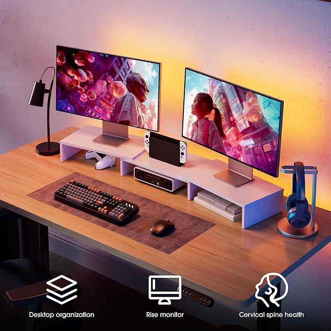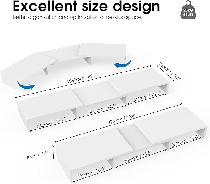 - 【Longer Size with More Space】At longest 42.7inch wide, this laptop riser is big enough to support two monitors. Depending on your setup, you may even have room to place a speaker or another device in the middle. Creates enough space underneath for smaller desk essentials, or to tuck your keyboard and mouse away.