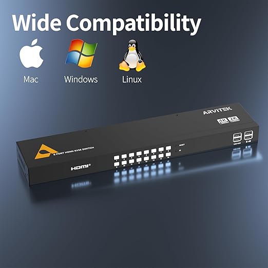 - 【KVM Switch 1 Monitors 16 Computers】Arvitek HDMI KVM Switch with 16 HDMI ports allows control of 16 computers, enabling them to share a single monitor along with keyboard and mouse. It's complete USB switch and HDMI switch rolled into one. This KVM Switch also supports various input devices such as PCs, Laptops, PS4, etc. It is compatible with various operating systems including Windows 7/8/10/11/Vista/XP, Linux, Mac, and more.