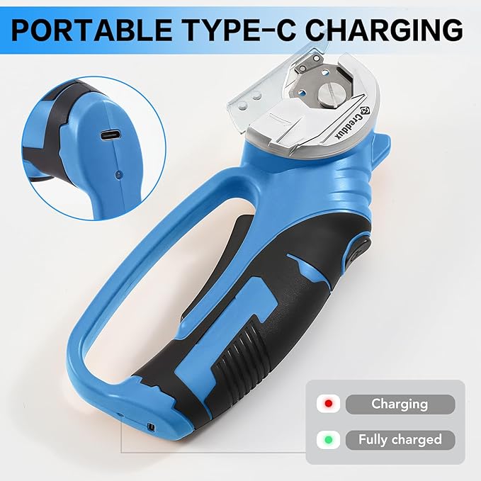 - Safety Start & Protection: First, press the safety button. Simply squeeze the specially designed handle, release the safety button, and then continue working. When you release the handle, the electric scissors will stop automatically. LED front light improves visibility in low light conditions