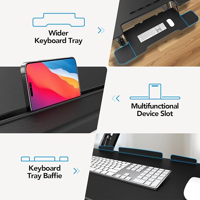 - Spacious 36" Surface: The desk riser features a 36″ x 20.5″ large top platform for dual monitors or a laptop and monitor combo. The optional 36″ x 8.3″ keyboard tray fits a full-size keyboard and mouse. An integrated device slot holds your phone or tablet for easy viewing and multitasking.