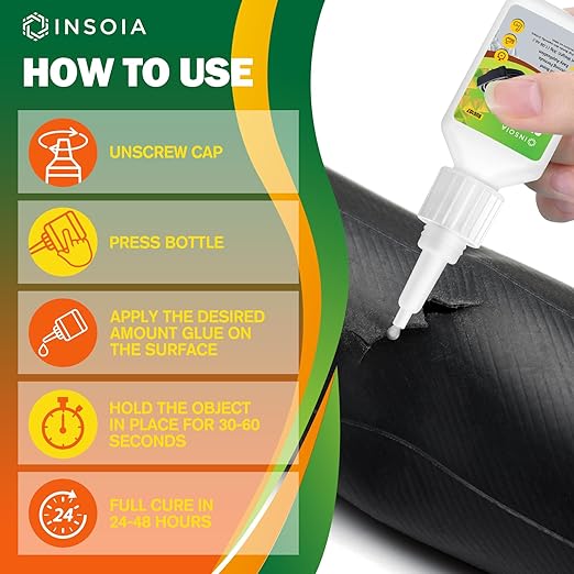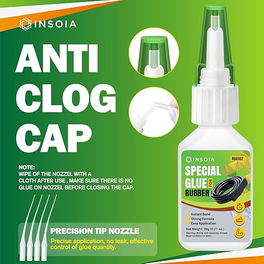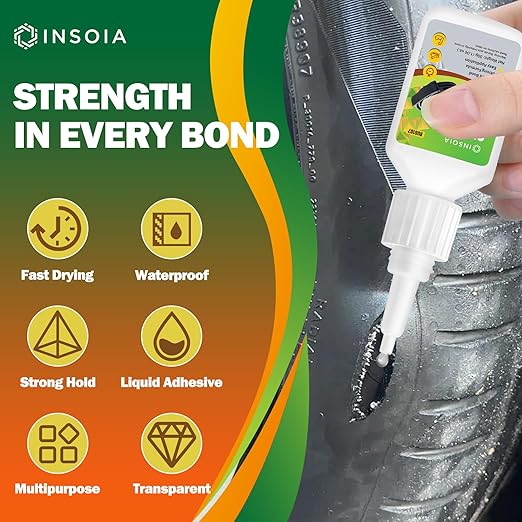- 🛞【Super Rubber Glue】INSOIA transparent Super Rubber Glue delivers industrial-strength bonding for all rubber-based repair needs. Designed to fix everything from RC tires and worn-out shoe soles to car seals, floor mats, hoses, and bike grips, this adhesive bonds rubber to rubber, rubber to plastic, metal, or wood. Whether it’s for automotive maintenance, household repair, or crafting, INSOIA ensures lasting performance without cracking or peeling.