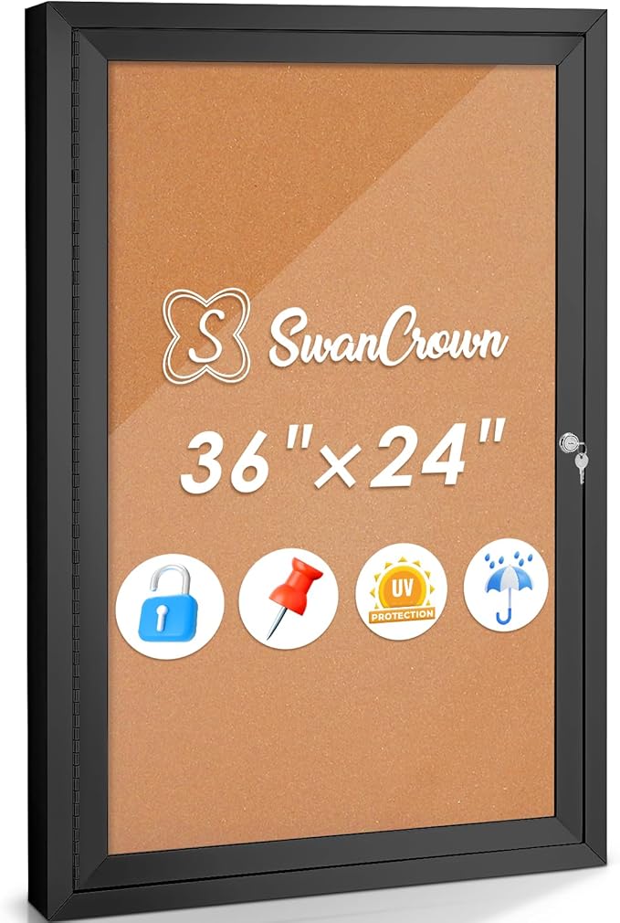 SWANCROWN Outdoor Bulletin Board 36x24in, Enclosed Bulletin Board with Locking Door Wall Display Case for Office School Commerce, Cork, Black Aluminum Frame