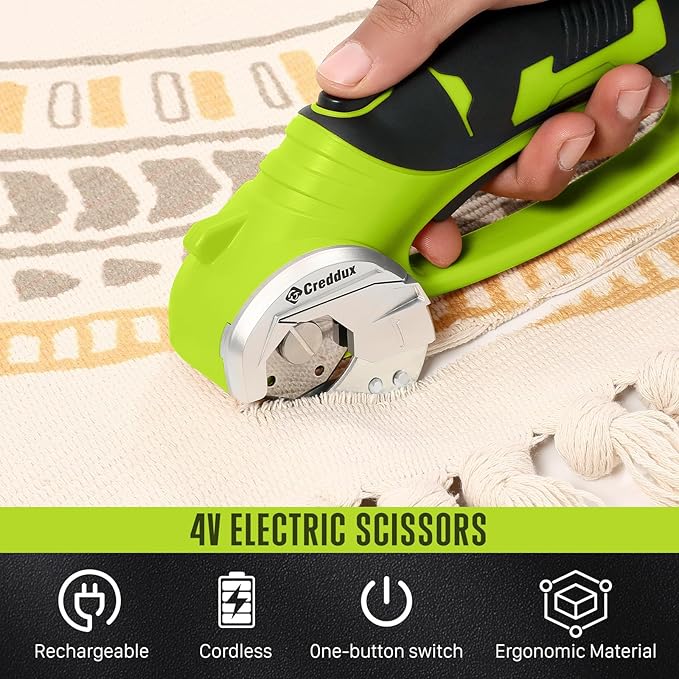 - Rotary Cutting Tool: Say goodbye to hand strain! The electric fabric cutter are designed to tackle tough materials like box, carpet, leather, denim, gift paper, and more with ease. The cordless electric scissors cuts cardboard easily and rapidly, making clean cuts every time