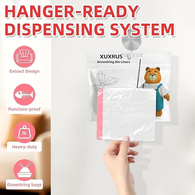 - Tear-Free Pull Design | Smooth Seal & Odor Control:The continuous pull system allows smooth, tear-minimized dispensing without perforations. Strong drawstrings help securely seal and contain regular odors—without strong scents.