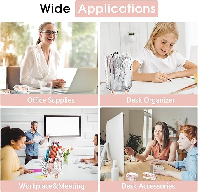 - 【6-Compartment Spinning Desk Organizer - Space Saver】Our clear acrylic pen holder features smooth 360° rotation for easy access to all your writing tools. Its clever 6-slot design maximizes storage while minimizing desk space. Perfect for your office, study desk, bedroom, or living area.