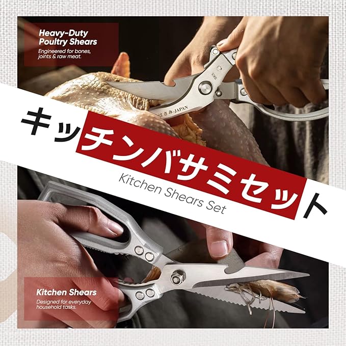 - True All-Purpose Duo for Everyday Prep. This kitchen scissors set is built for full-spectrum kitchen prep: the poultry shears handle raw poultry, chicken bones, turkey and seafood, while the kitchen shears excel at herbs, salads, fruits, packaging, twine and lighter kitchen tasks—plus cooked foods like pizza or deli slices. Having both means one set solves bulk prep, delicate trimming and quick kitchen fixes. The poultry shears also offer extra functions like a bottle opener and fish scaler.