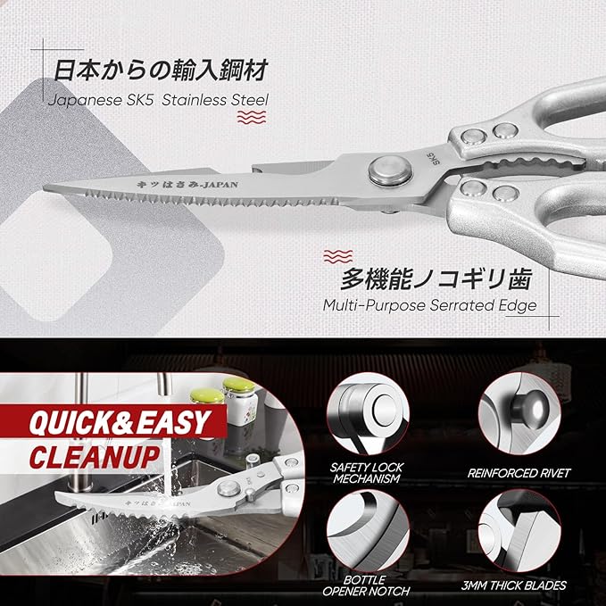 - Japanese Craftsmanship – Premium SK5 Steel. Expertly crafted with Japanese SK5 high-carbon steel, these kitchen scissors stand apart from ordinary stainless steel scissors. The blades undergo precise heat treatment and tempering, giving them superior hardness, edge retention, and resistance to wear and corrosion. With Japanese craftsmanship ensuring flawless construction and balance, you get exceptional cutting performance that lasts for years.