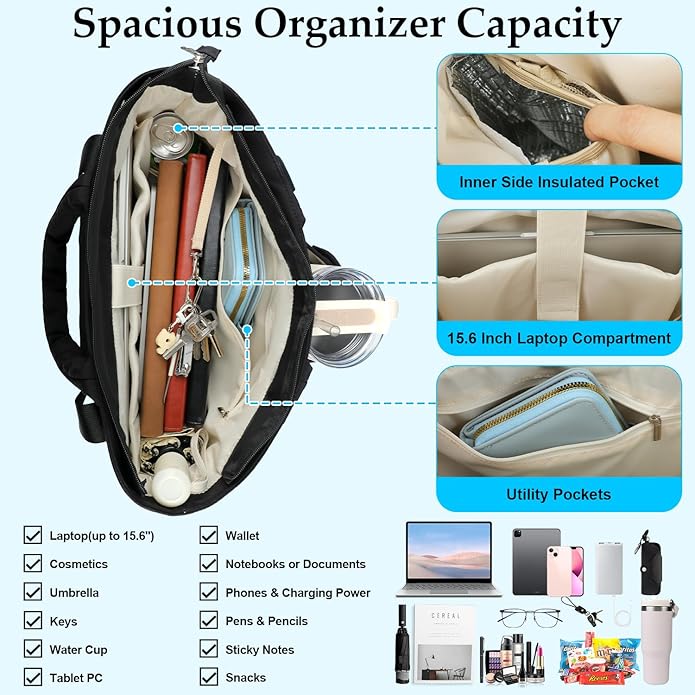 - 【15.6 Inch Laptop Pocket& Smart Organizer】This laptop tote bag for women is large capacity, features with 15.6 inch padded laptop compartment to protect your computer. Various types of inner pockets help you classify office supplies, school documents and other small personal items. It is convenient to get your key with the long inner keychain, and the large external pockets are easily accessible for your water bottle, umbrella and other travel essentials.