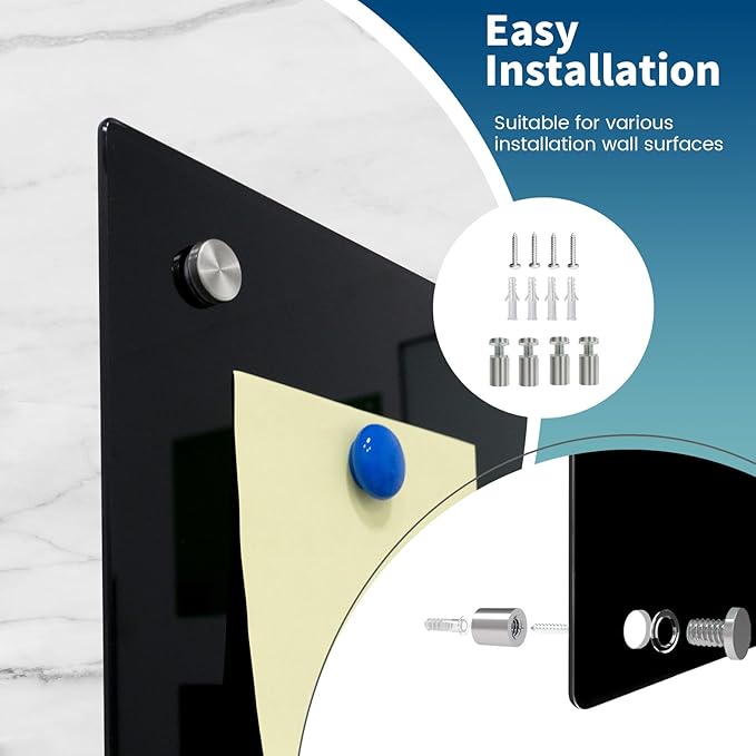 - Arc design: Glass magnetic dry erase board adopts 2.5D edge arc, R5 corner safety design and 0.12-inch thickness anti-collision. The black board glass whiteboard comes with a 1:1 scale installation template and adhesive tape.