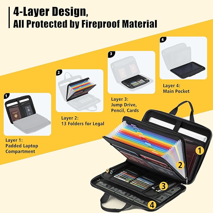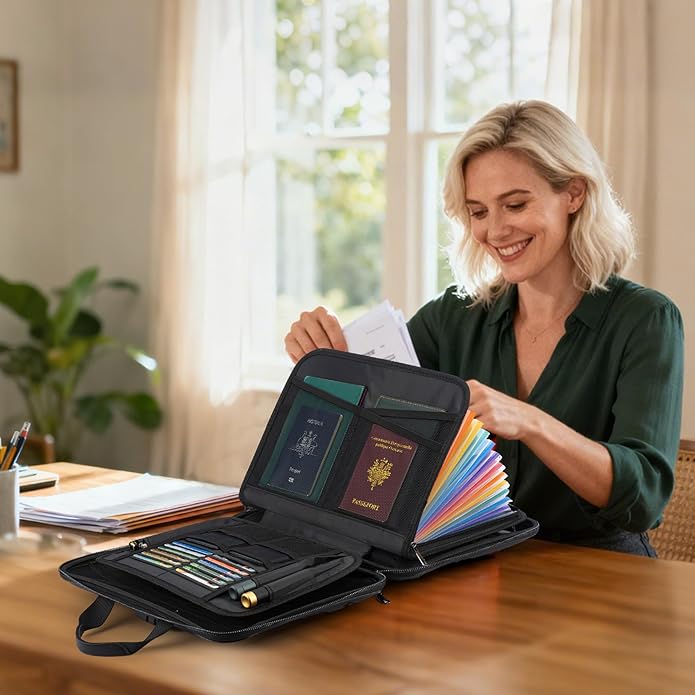 - 13-Pocket File Folder & Organization: We designed this fireproof file folder for unparalleled organization. Features a multi-layer system: a 13-Pocket Accordion File Folder with labels, 1 zipper pocket, 4 pen slots, 14 card slots, dedicated passport holders, and mesh bags. Keep your important papers, money, passports, and certificates safely and orderly secured.